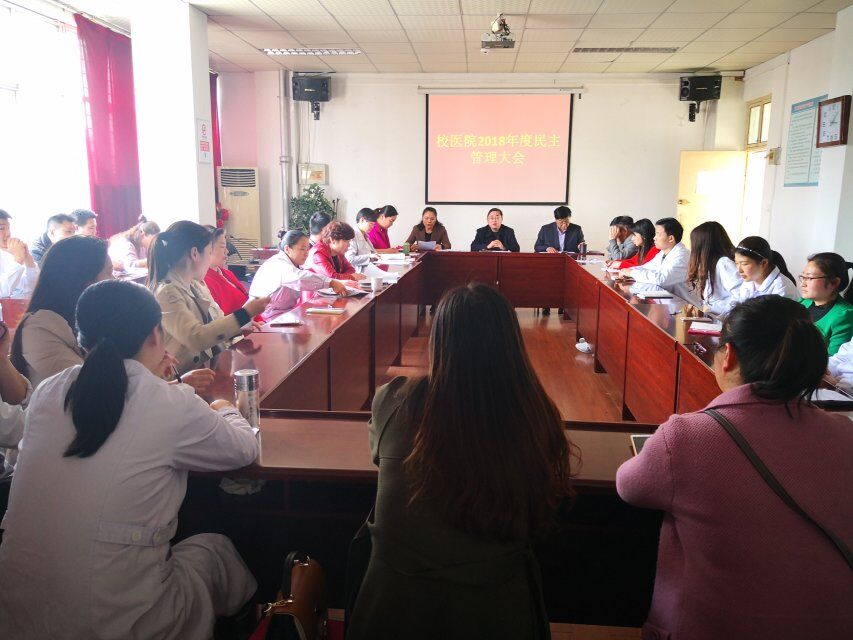 2018年3月27日下午,校医院在医院三楼会议室召开了2018年职工民主管理大会。校医院副院长郜中明、党支部书记齐保东、副院长华成丽分别做行政工作报告、工会工作报告和医院财务工作报告,校医院全体职工参加会议。会议由副院长孙侠主持。