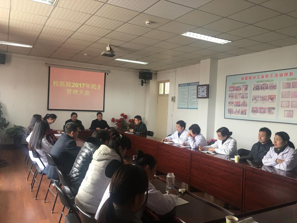 3月21日下午,校医院隆重召开了2017年职工民主管理暨工会会员大会,选举产生校医院分工会委员会。校医院副院长郜中明、党总支书记齐保东分别做行政工作报告和工会工作报告,校医院全体教职工参加会议。会议由校医院党政办主任华成丽主持。