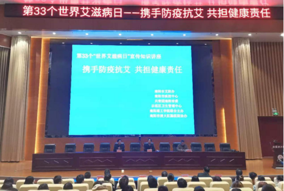 在第33个“世界艾滋病日”来临之际,为进一步推动艾滋病防治工作,全面落实《中国遏制与防治艾滋病“十三五”行动计划》,营造全民参与艾滋病防治工作的良好氛围,11月30日上午,南阳理工学院校医院、学生处、团委牵头、联合南阳市艾防办、南阳市疾控中心、共青团南阳市委、示范区卫管中心、特邀市疾控中心防艾专家卢千超主任,在我学院3号报告厅针对300余名在校大学生开展了以“携手防疫抗艾 共担健康责任”为主题的大型知识讲座活动。