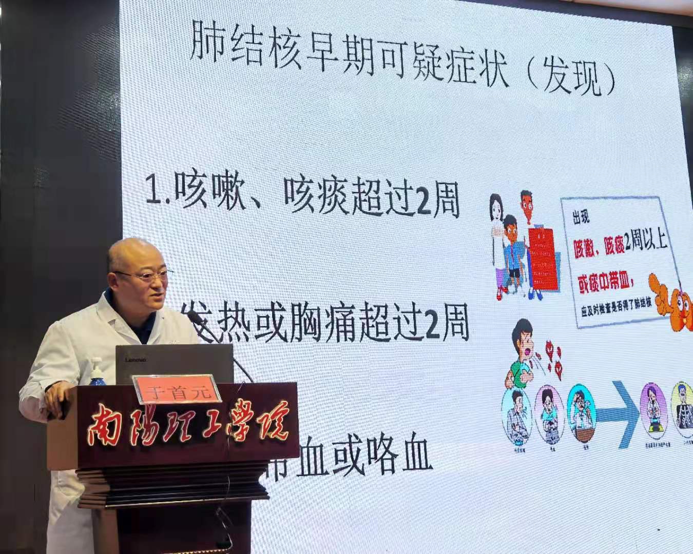 在世界防治结核病日到来之即,3月19日下午,校医院联合南阳市结核病防治所开展第26个世界防治结核病日活动,该所副主任中医师于首元为我校200余名师生作了结核病防治专题讲座。我校副校长王玉磊出席开幕式并做了讲话,学生处、团委、后勤管理与服务中心、校医院的主要负责人参加了此次活动。