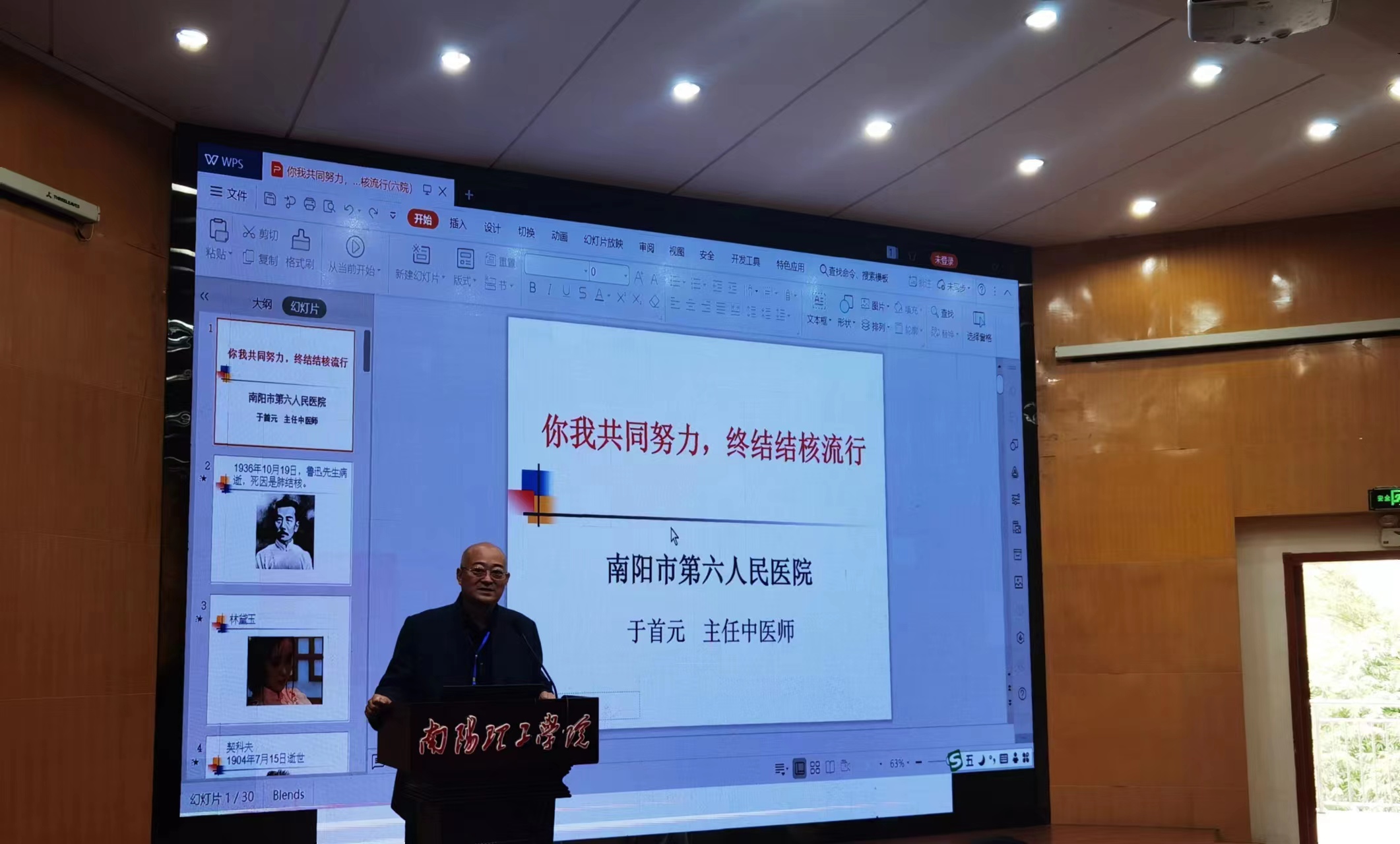 3月24日上午,校医院联合南阳市第六人民医院开展第28个”世界防治结核病日”活动,南阳市第六人民医院主任中医师于首元,为我校300余名师生作“你我共同努力,终结结核流行”专题讲座。旨在深入贯彻党的二十大精神,呼吁社会各界广泛参与,共同终结结核病流行,维护人民群众的身体健康。副校长郝好山、学生处、团委、后勤服务中心、各教学院团总支书记、校医院主要负责人参加此次活动。