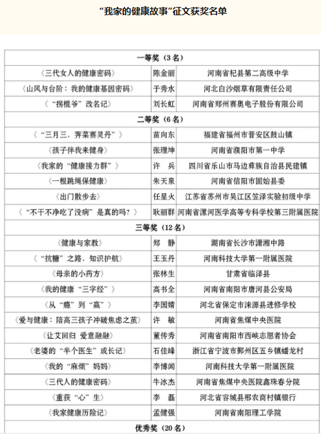 (特约记者 张芳)近期,由河南省卫生健康委员会宣传处指导,河南省健康中原服务保障中心与医药卫生报社联合主办的“我家的健康故事”全国征文活动评选结果揭晓。在校医院的指导推荐下,我校孟健强的作品《我家健康历险记》脱颖而出,荣获三等奖。