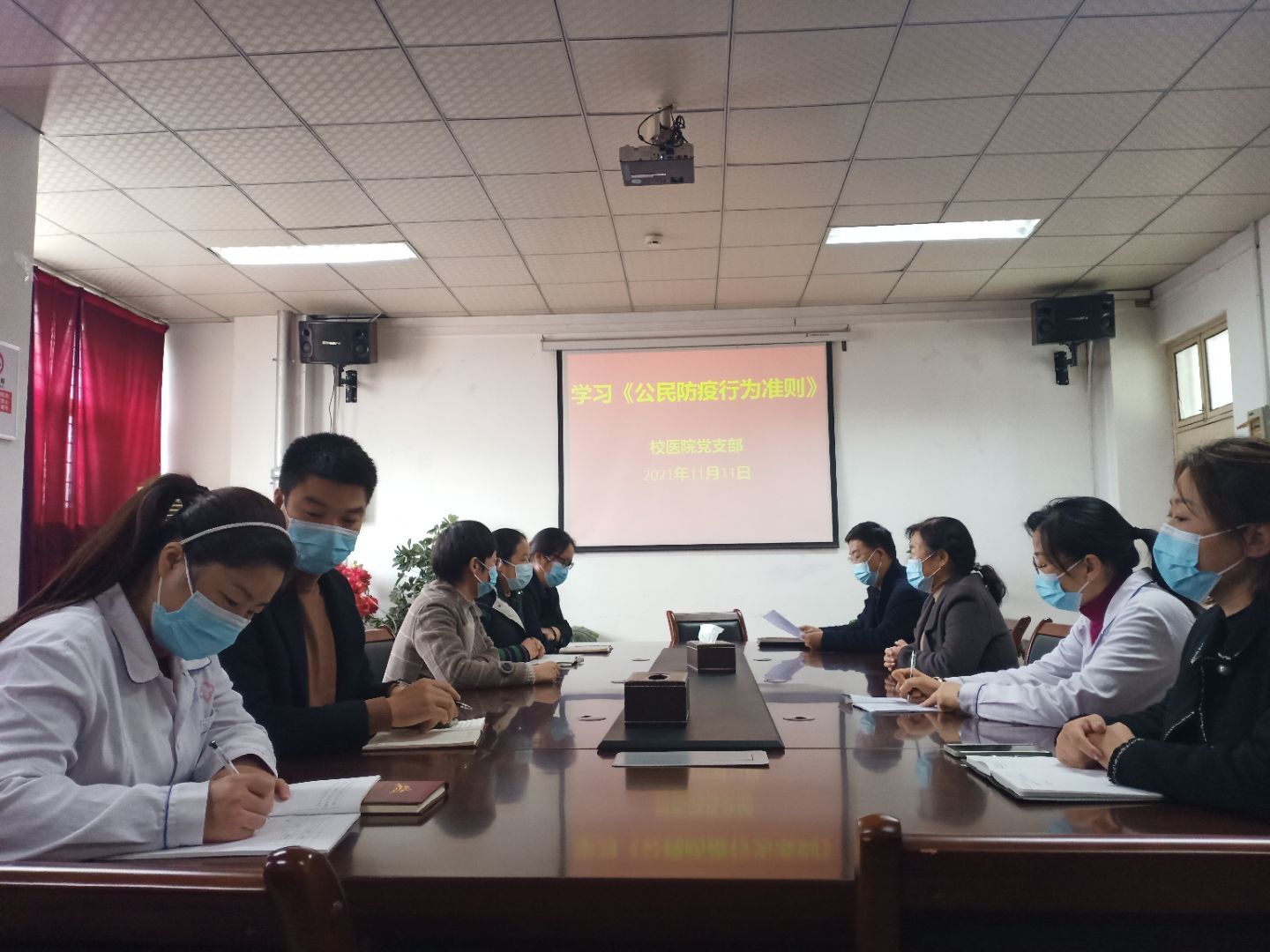 按照《关于在全市开展“学习公民防疫行为准则”主题党日活动的通知》要求,校医院党支部于2021年11月11日下午组织开展了学习宣传准则活动。